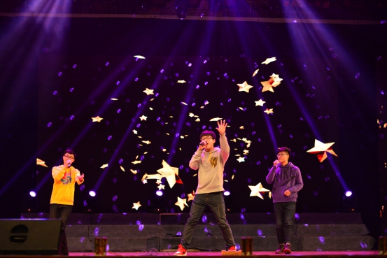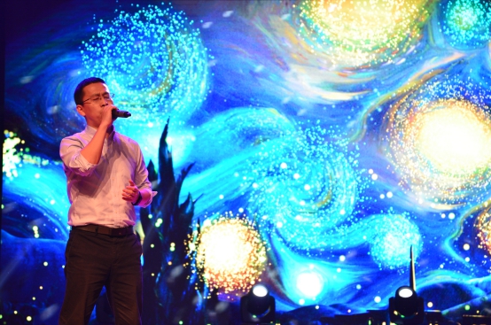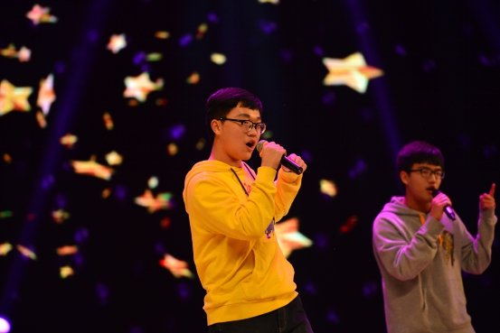 这个灯火辉煌的夜晚带给我们的不仅是视觉的享受,也让我们的耳朵与音乐来一场美丽邂逅。流行歌曲串烧节目很荣幸邀请到王斌书记与梅仂盈辅导员上台献唱《给自己的歌》,“似水流年”冠军杨江陵自弹自唱的《Let her go》深情婉转,三名新生合唱的《青春修炼手册》和《离开地球表面》释放阳光活力,燃烧青春热情。微亮的舞台灯光,美妙静谧的背景视频以及那醇厚朴实的嗓音,民谣又如一杯老酒,一碗小米粥,滋润我们喧闹后逐渐沉寂下来的心灵。