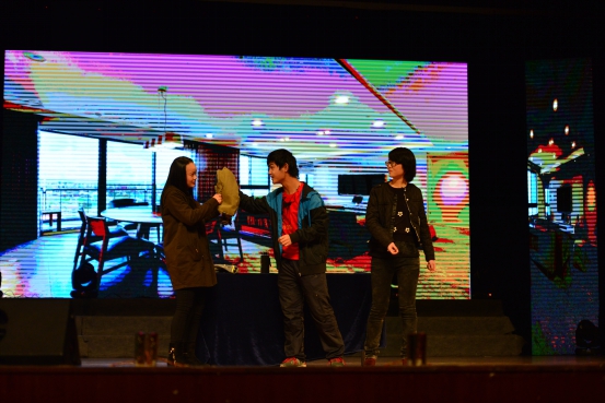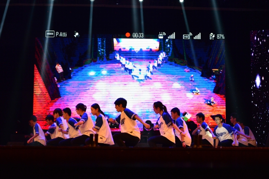 晚会开场首先由副院长殷国栋老师致辞,伴随着倒计时与隆隆的擂鼓声,迎新晚会正式开始。动感酷炫的开场舞Electric Shock充分带动现场气氛,在冷烟喷薄而出的瞬间引爆全场。由本院独创的创意舞蹈I·Robot将现代舞元素与前沿科技成果完美结合,首次将机器人搬上舞台,与演员们进行一场有趣的互动较量,让观众耳目一新。双截棍表演《龙舞》一招一式刚劲有力,威武霸气,暗场表演彩棍挥舞起来五光十色,绚丽夺目,赢得观众一片叫好。