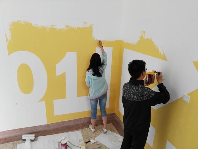 周末,同学们手拿铅笔、丁尺,忙碌在一到五层的楼梯口处。墙上线稿绘制结束后,同学们又化身粉刷匠,为白色的墙壁添上不同的色彩。同学们虽不是艺术出身,却一点也不逊色。从一楼到五楼,黄色、橙色、绿色、蓝色、紫色,每一种颜色让人眼前一亮,带来一天的好心情。最后,在楼层标识的一角,同学们还留下了自己集体的独特印记。