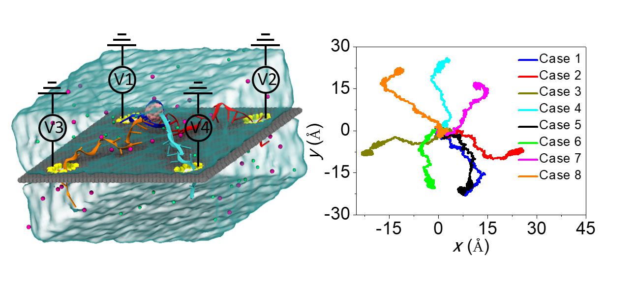 随着科技进步的发展,科学家们已经在人体内发现了众多的机器蛋白,如细菌鞭毛马达和肌球蛋白等,人体的正常工作离不开这些马达蛋白的协同作用。然而在探索生命的过程中仅仅去发现潜在的未知蛋白机器是远远不够的,设计和制造全新的仿生纳米机器也将进一步促进人类在生命科学领域的发展。司伟老师依托我院江苏省微纳生物医疗器械设计与制造重点实验室平台,设计研究了一种由纳米颗粒和DNA链组装而成的四足纳米机器人,通过调控石墨烯薄膜上正方形分布的四个纳米孔上的壁面电势,改变了纳米孔上的电荷特性和强度,为纳米机器人在纳米薄膜上的行走提供了动力支持。通过对纳米孔内的电渗和电泳的有效调控,形成电渗和电泳的联合或竞争驱动机制,通过详细的试验设计和数据分析,掌握了纳米机器人的驱动机理,实现了纳米机器人的精准定向移动。由于该机器人行走在固态薄膜上,易与半导体芯片进行集成,有望封装在极小尺度的芯片内,具有较高的便携性和实用性,可协助解决纳米尺度下的纳米操控问题和分子货物运载问题,将潜在应用于药物输送等关键诊疗领域,造福人类。