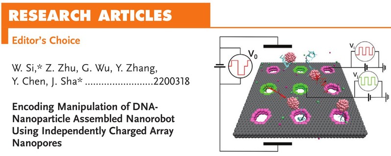 在过去的几十年里,科学家们开发了基于各种驱动原理的不同类型的纳米机器人,以实现对它们的控制操作,从而在医疗诊断和定向货运等潜在应用中发挥作用。医疗机器人可以在适应人体的前提下,进行复杂、准确的诊断和治疗操作。多功能纳米机器人将允许自己进入人体的几乎所有部位,将手术细化到细胞甚至分子水平,并以更高的准确性和效率提供局部诊断和治疗。不可否认,纳米机器人有其独特的特点,在某些特定任务中表现良好。然而,要加速微纳机器人技术的发展,仍有许多挑战和局限性有待解决。论文中设计了由一条单链DNA(ssDNA)或两条ssDNA和一个纳米粒子组装而成的新型纳米机器人。它们的运动由电泳和电渗共同控制,所构建的纳米机器人可以在石墨烯膜上移动,阵列纳米孔通过编码以调节其表面电荷。利用外加电场和每个纳米孔的表面电荷密度的控制策略,实现对纳米机器人的编码驱动与操控。论文在理论上通过电渗和电泳的结合以及它们之间的竞争实现了纳米机器人的定向操控,包括:单足纳米机器人的捕获跳跃移动,双足纳米机器人的捕获跳跃移动和双足纳米机器人捕获后在双孔之间的爬行。