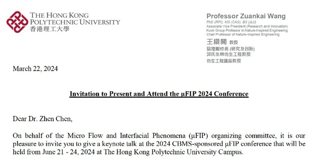 在刚刚过去的2024年微流体与界面现象(Micro Flow and Interfacial Phenomena)学术会议上,我院陈震教授受邀作为keynote报告人出席。
