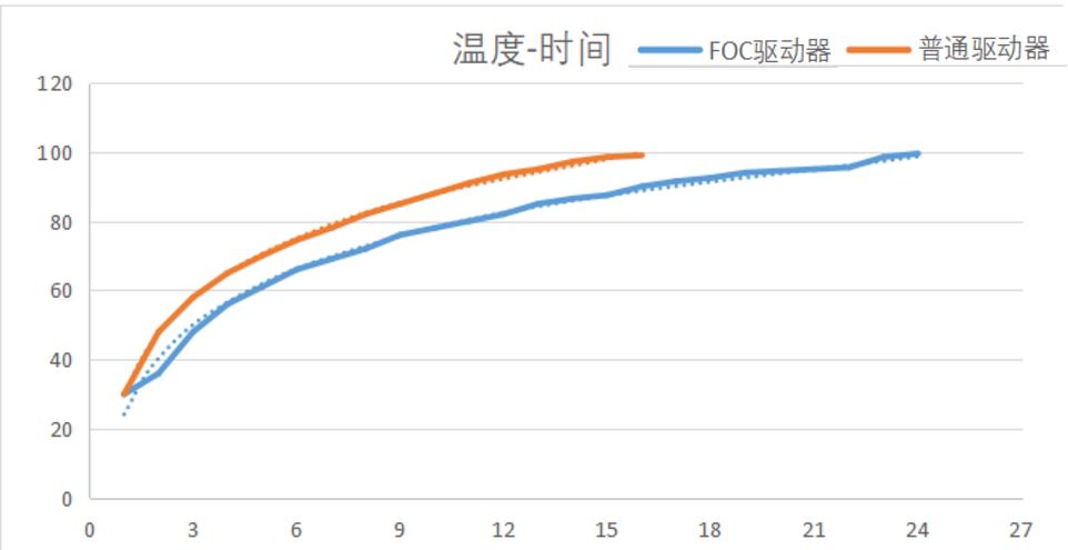 在相同扭矩为0.2NM的情况下,普通驱动器在15min内温度由室温提升到100摄氏度;而FOC驱动器在24min内温度由室温提升到100摄氏度。由此可见,FOC驱动器能够提高电机持续工作的时间,提升比例为60%。